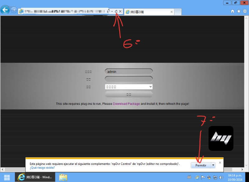 Para realizar los pasos de la instalación inicial en su máquina con Windows: abrir una ventana del navegador «Internet Explorer», escribir en la barra de direcciones, como se muestra en la siguiente imagen (circulo rojo), la dirección del equipo DVR :