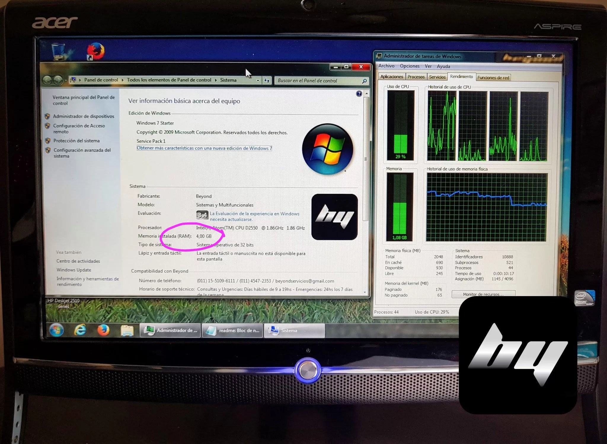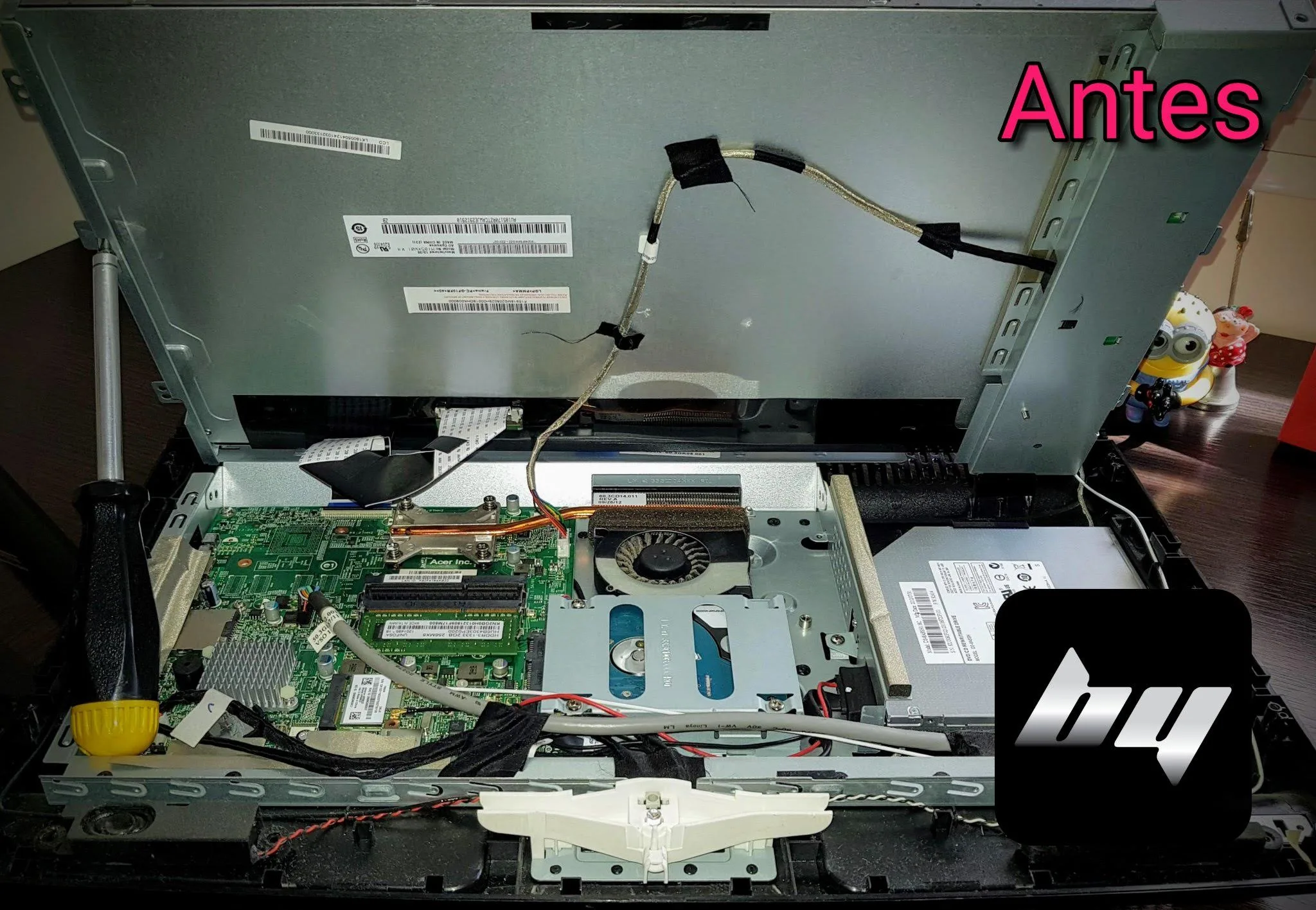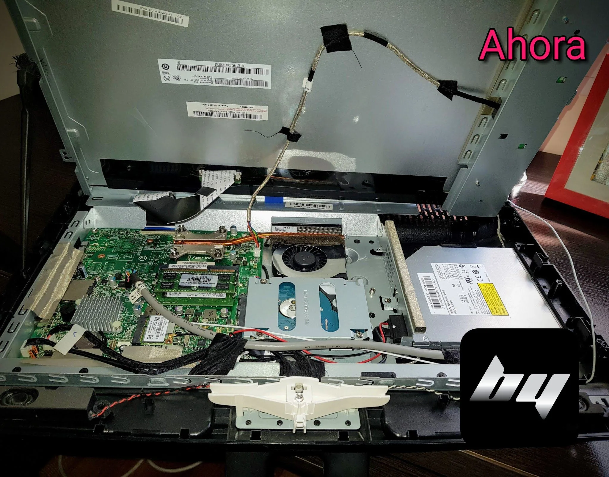 Esta computadora All-in-one Acer funcionaba muy lento el Windows y nunca habían hecho un servicio técnico. Lo solucionamos en un servicio técnico a domicilio: desarmamos el equipo (foto 1), hicimos una limpieza interna (foto 2), ampliamos la memoria con una RAM nueva de 2gb (foto 3) quedando así en total 4gb (foto 4) y por último limpiamos, actualizamos y optimizamos el sistema operativo y los programas.