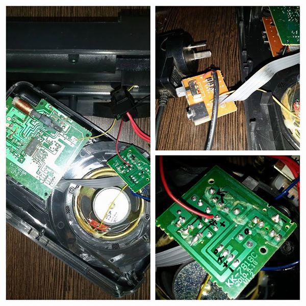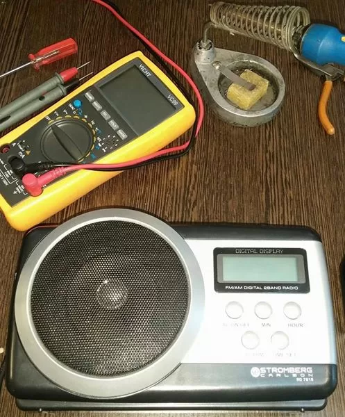 Esta radio am/fm se quemó por un pico de tensión. Lo solucionamos reemplazamos la fuente interna por una externa de cargador de celular antiguo, así reciclamos y evitamos gastos.
