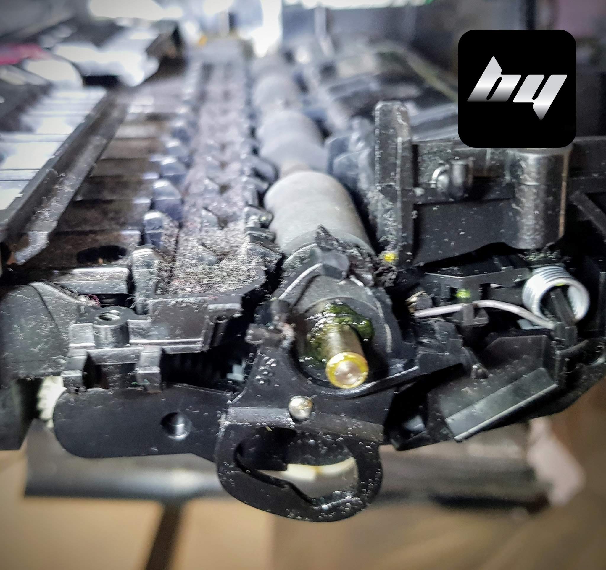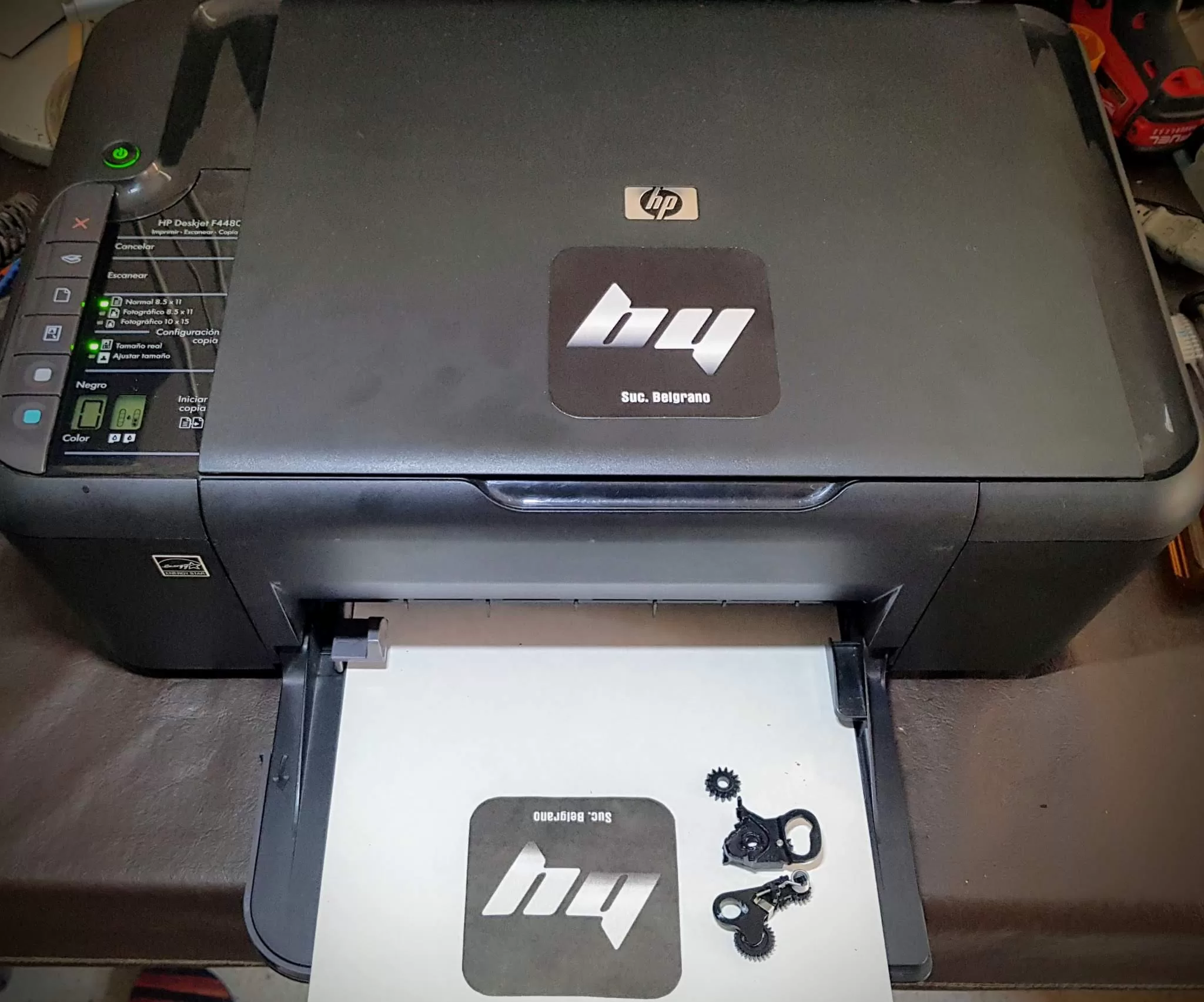 Esta impresora multifunción de tinta HP f4480 dejó de levantar papel de un momento a otro. Lo solucionamos haciendo una diagnóstico del mecanismo y encontrando una leva rota (foto 1). Desarmamos todo el mecanismo (foto 2), limpiamos y reemplazamos la pieza (fotos 3 y 4). Lubricamos y armamos todo de nuevo, y verificamos el funcionamiento (fotos 5 y 6).