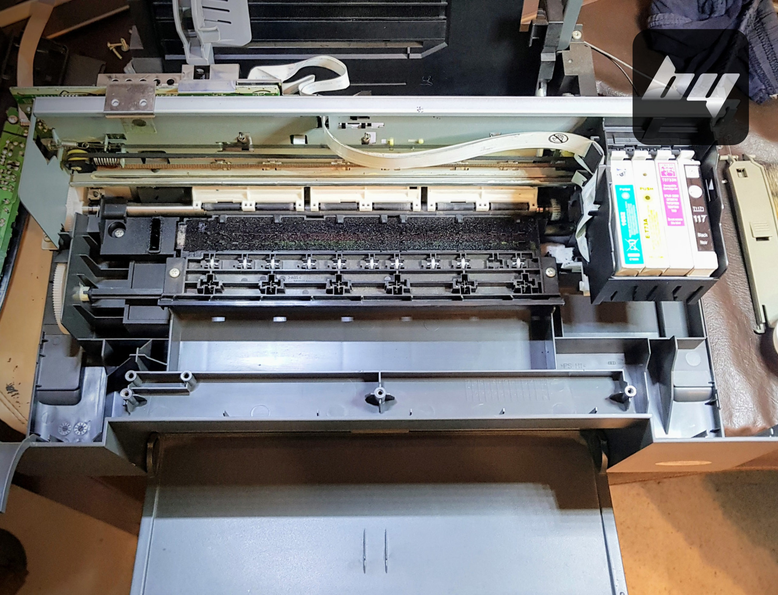 Esta impresora multifunción de tinta Epson TX110 tenía los cabezales tapados. Lo solucionamos haciendo una limpieza interna completa y de cabezales.