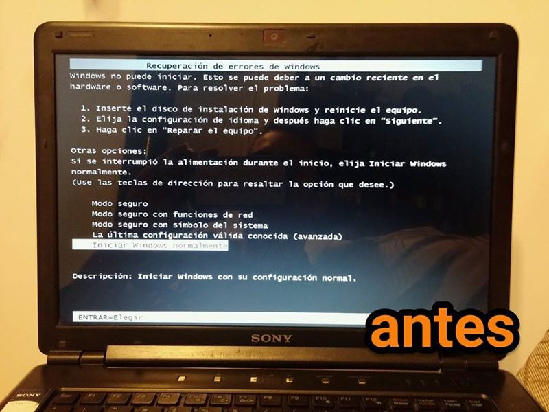 Este es un caso frecuente donde Windows no arranca dando errores similares a la primer imagen. Esta vez fue una Notebook Sony con errores en el sistema de archivos. Hicimos un backup completo de la información de la dueña, formateamos e instalamos el sistema operativo Windows optimizado. Se aprovechó el servicio para duplicar la memoria RAM y limpiar todas las ventilaciones para prevenir futuros daños