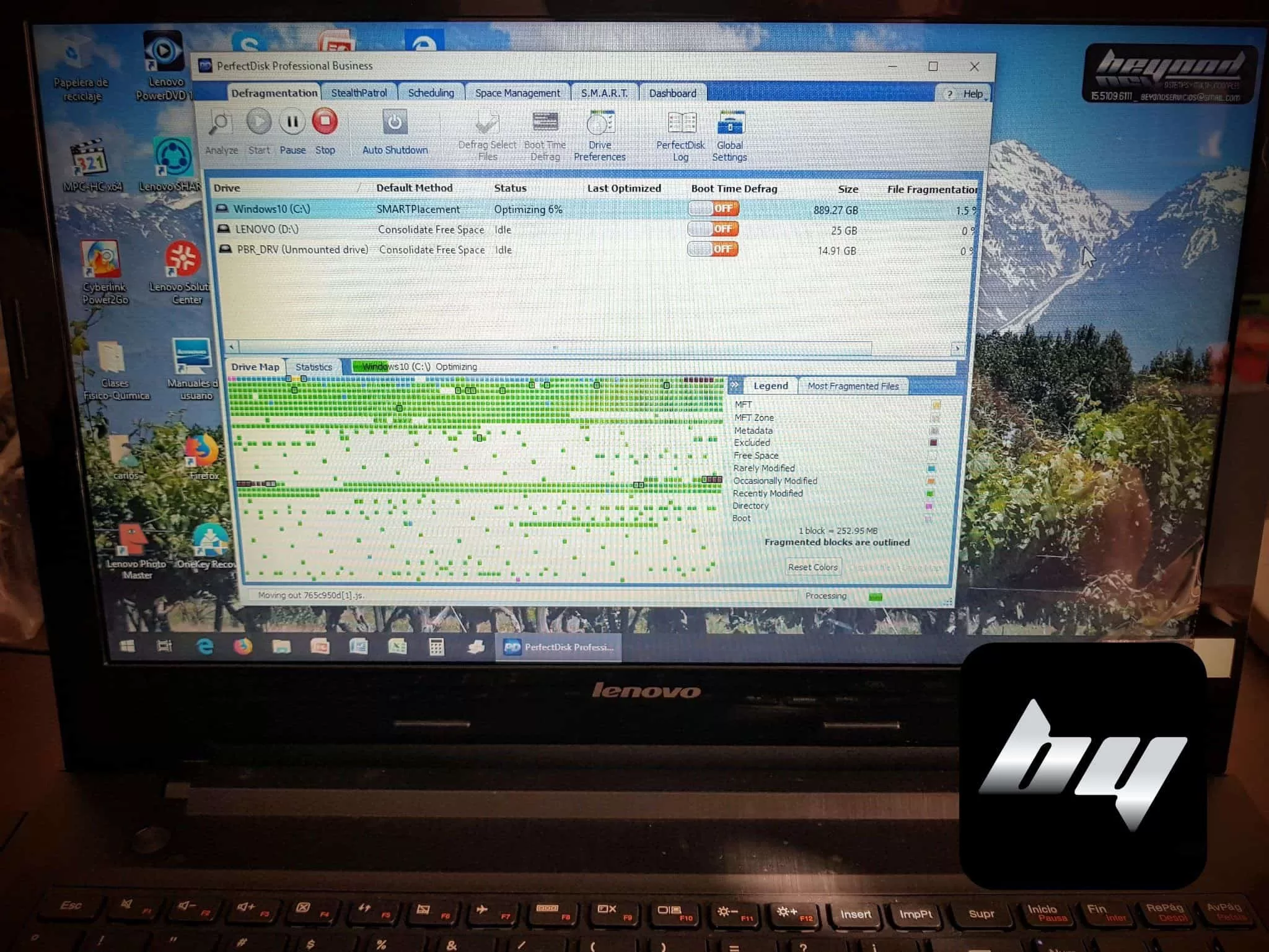 Esta Notebook Lenovo se le rompió la pantalla por un golpe (foto 1). Lo solucionamos desarmando el equipo por completo (foto 2) para reemplazar la pantalla por una nueva. Aprovechamos la oportunidad para realizar un mantenimiento: una limpieza interna completa (foto 3) ya que venía trabajando con elevada temperatura, y lubricación de bisagras (foto 4) porque estaban muy duras (y pueden generar el mismo u otro daño físico). También hicimos una limpieza y actualización del sistema operativo Windows y programas (fotos 5, 6 y 7). Y una limpieza y optimización del sistema de archivos (fotos 8 y 9). Todo esto para dejar el equipo en su máximo desempeño.