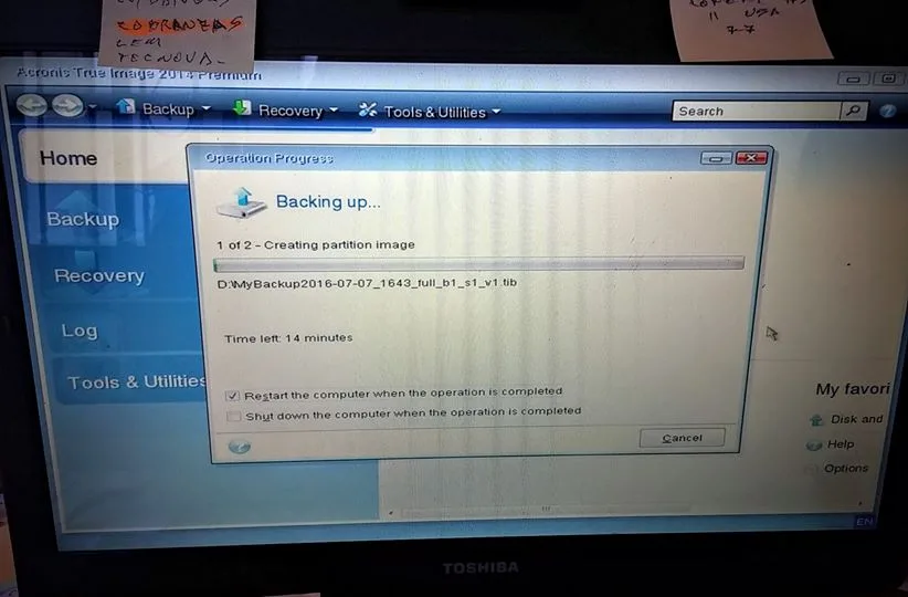 Esta  Notebook Toshiba Satellite es un caso frecuente donde Windows no arranca dando errores similares a la primer imagen. Restauramos un backup completo del sistema y actualizamos el sistema operativo Windows y los programas instalados. Al final hicimos un nuevo backup completo. Todo en menos de 1 hora.